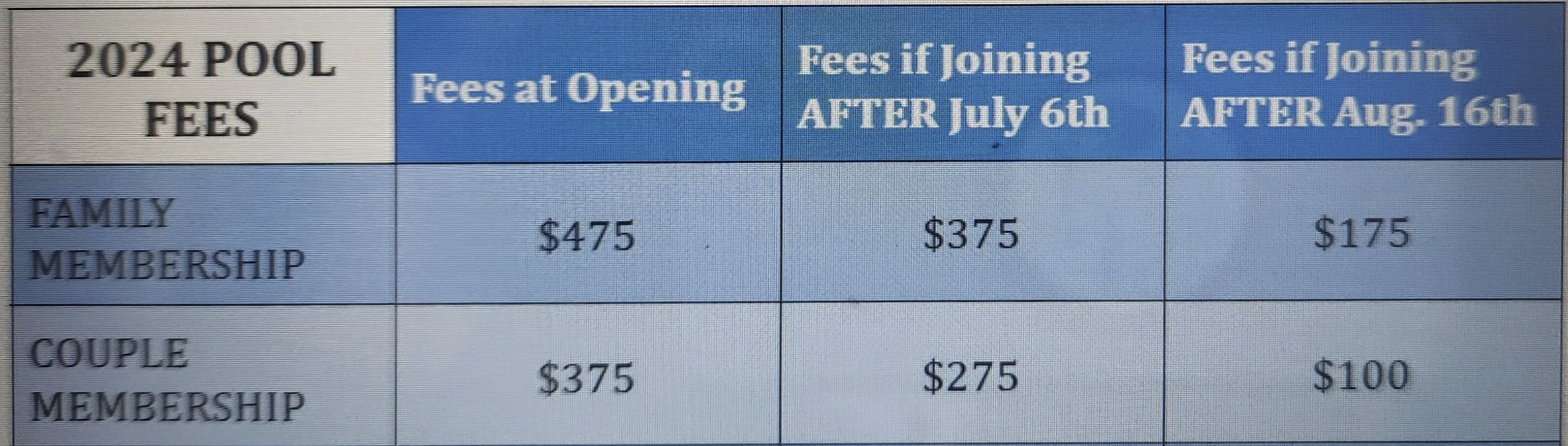Fill out all forms (preferably on-line), write a check for the appropriate fee and deliver to…. No paperwork or checks are to be turned in to the pool monitors. Our membership fees for the summer of 2026 are $475 per family and $375 per couple. Babysitter fees are the same.